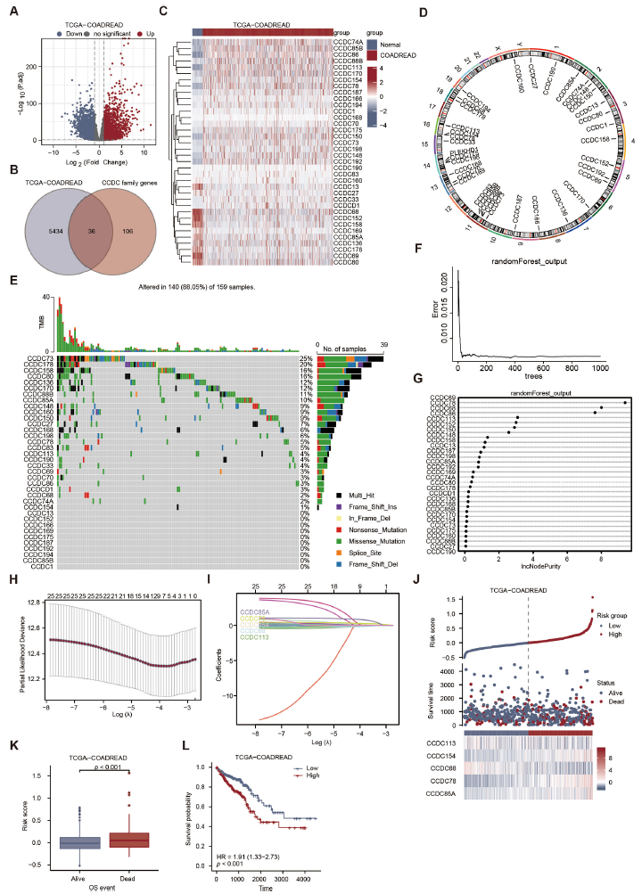 研究团队首先利用TCGA数据库中的结直肠癌数据集(TCGA-COADREAD),系统分析了36个CCDC家族成员的表达谱与临床相关性。通过差异表达分析、随机森林算法和LASSO回归,筛选出5个具有预后价值的CCDC基因(CCDC85A、CCDC79、CCDC154、CCDC68、CCDC113),并建立了基于这些基因的CCDC评分模型。该模型能够有效区分结直肠癌患者的总生存期(HR=1.91, p<0.001)。