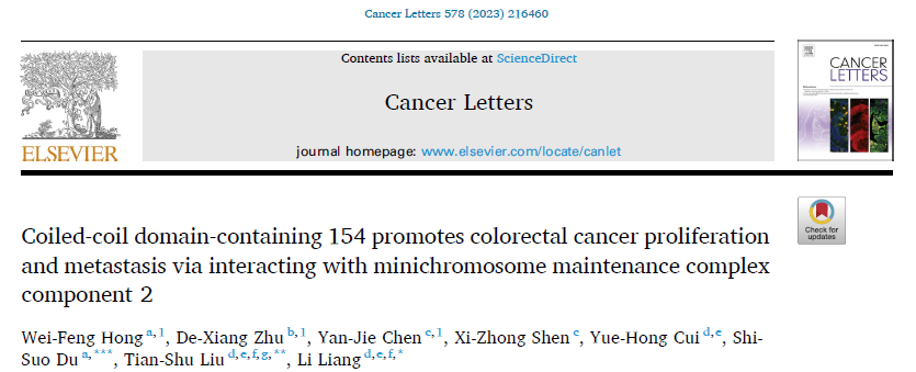 2023年12月,复旦大学附属中山医院研究团队在《Cancer Letters》期刊(2023, 578: 216460)发表了题为《Coiled-coil domain-containing 154 promotes colorectal cancer proliferation and metastasis via interacting with minichromosome maintenance complex component 2》”的研究论文。该研究首次系统评估了卷曲螺旋结构域(CCDC)蛋白家族在结直肠癌中的临床价值,并深入揭示了CCDC154通过与MCM2相互作用促进肿瘤增殖与转移的分子机制,为结直肠癌的诊断与治疗提供了新的潜在靶点。