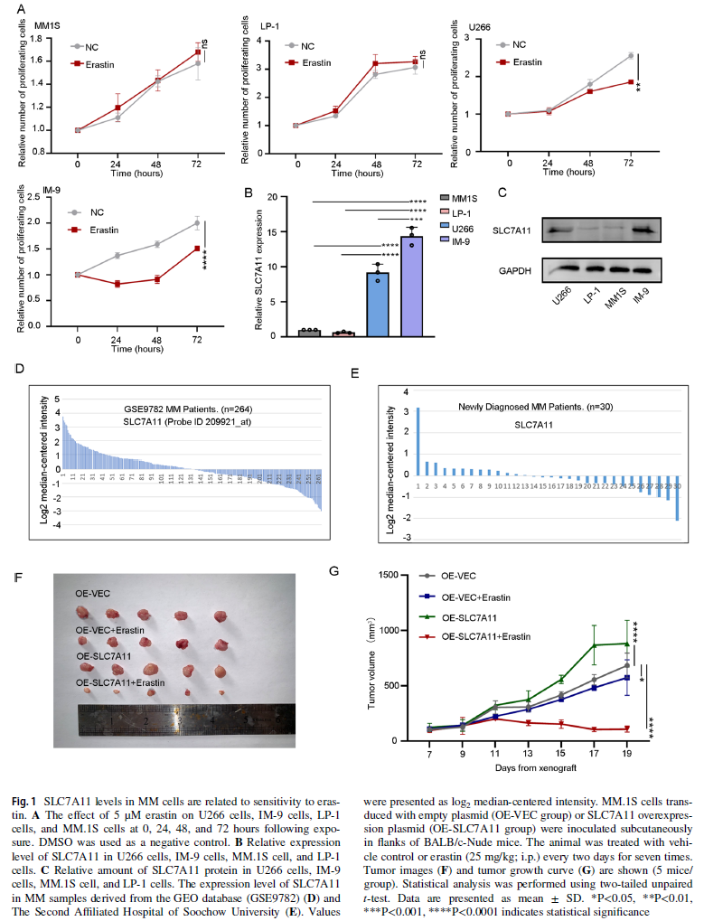 揭示MM对erastin敏感性的异质性基础:此前研究认为MM对erastin诱导的铁死亡不敏感,但本研究发现这种不敏感性具有细胞类型依赖性,高表达SLC7A11的MM细胞反而对erastin高度敏感。这一发现挑战了既有认知,为基于铁死亡的MM精准治疗提供了重要依据。